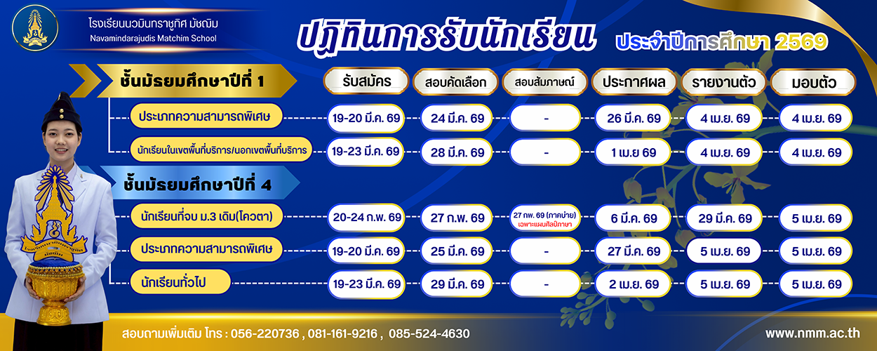 | ประกาศโรงเรียนนวมินทราชูทิศ มัชฌิม เรื่อง การรับสมัครนักเรียน ประจำปีการศึกษา 2569 | |||
